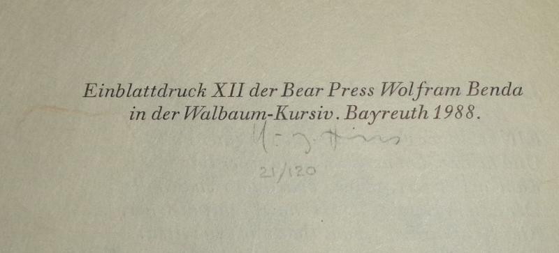2 Blatt. Grüne Orig.-Broschur mit schwarzem Titeldruck. 30 : 20,5 cm. * Einbalttdruck XII der Bear Press Wolfram Benda. - 21 von 120 numerierten Exemplaren (hier Exemplar Nr. 21), Druckvermerk vom Künstler signiert, Druck in der Walbaum-Kursiv auf Bütten. - Pfeffels Gedicht stammt aus dem Jahr 1791. - Sehr gut erhalten.