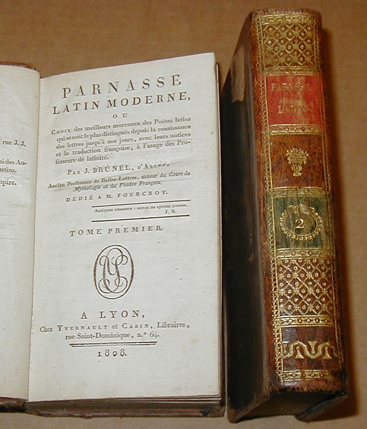 rare booksBRUNEL, D'Arles J: PARNASSE Latin Moderne Ou Choix des meilleurs des Poètes latins qui sont le plus distingués depuis la Renaissance des lettres jusqu'à nos jours, avec leurs notices et la traduction françoise; à l'usage des professeurs de latinité.. I-II- köt.