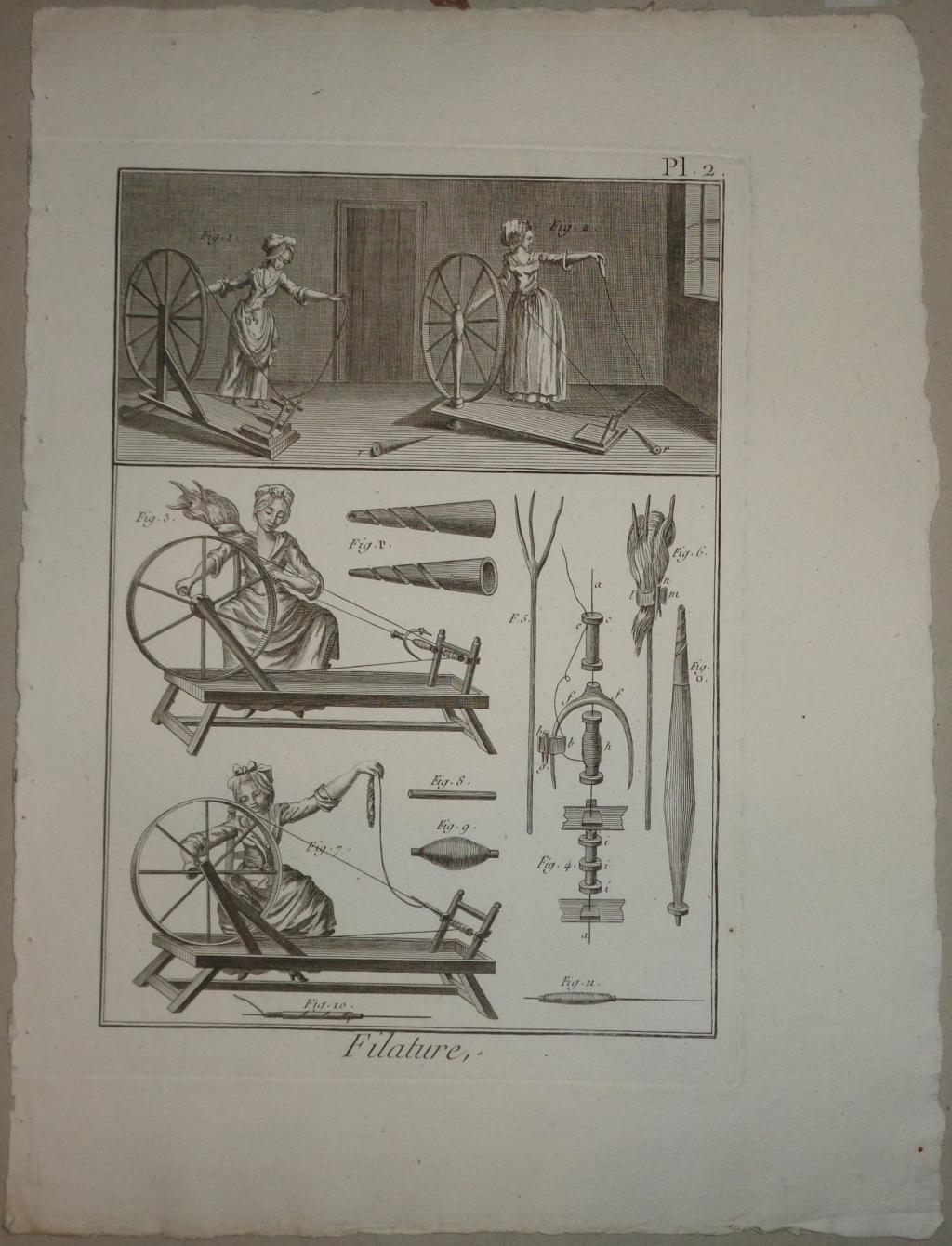 profession, industry history put into the basket Robert Bénard (1734–1777): Filature, Rouet et Devidoirs. I-V. (Fonás, rokka és motollák (fonalgombolyítók)-(Spinning).