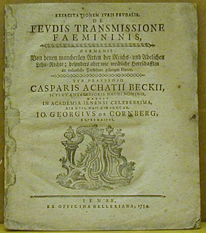 Exercitationem Iuris Feudalis, De Feudis Transmissione Faemininis, Germanis: Von den mancherley Arten der Reichs- und Adelichen Lehn-Rechte, besonders aber wie weibliche Herrschafften an männliche Persohnen gelangen können. Sub Praesidio Casparis Achatii.