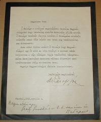 Reményi-Schneller Lajos pénzügyminiszter kinevezési értesítése Bányai Zoltánnak.