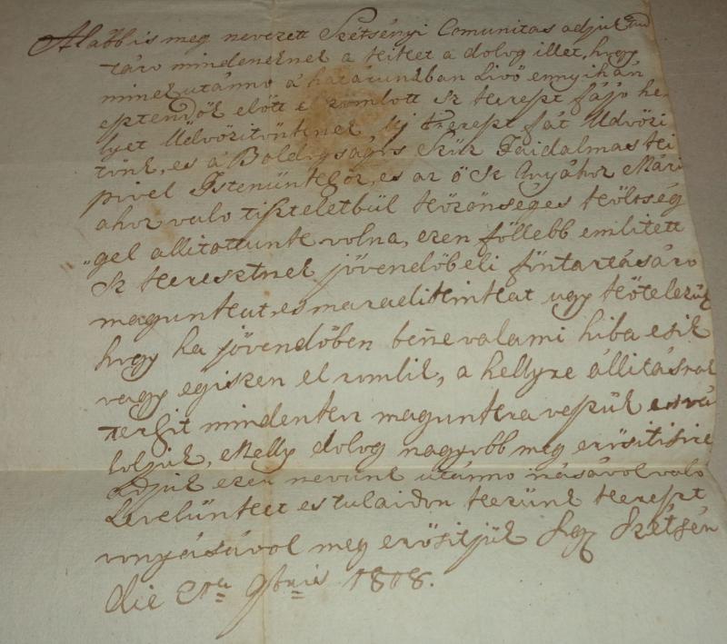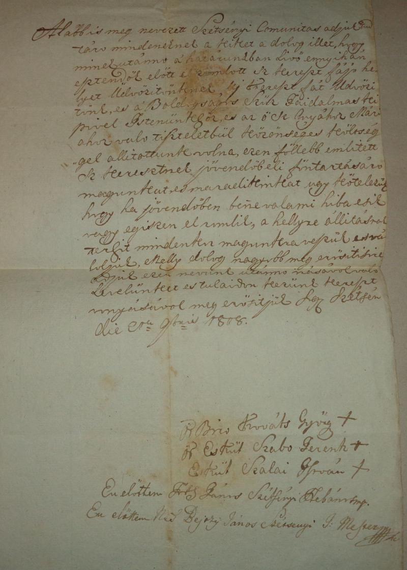 Szűzanya tiszteletére közös költségen új keresztet állítottunk, annak jövőbeli fenntartására ezennel kötelezettséget vállalunk. Magunk és utódaink nevében fogadjuk, hogy ha a kereszt a jövőben meghibásodna vagy teljesen tönkremenne, annak helyreállítási költségeit és terheit bármikor magunkra vállaljuk. Ennek megerősítéseként írtuk alá nevünket és tettük oda saját kezű keresztvonásunkat. Kelt Szécsényben, 1808. június 27-én.