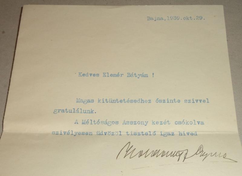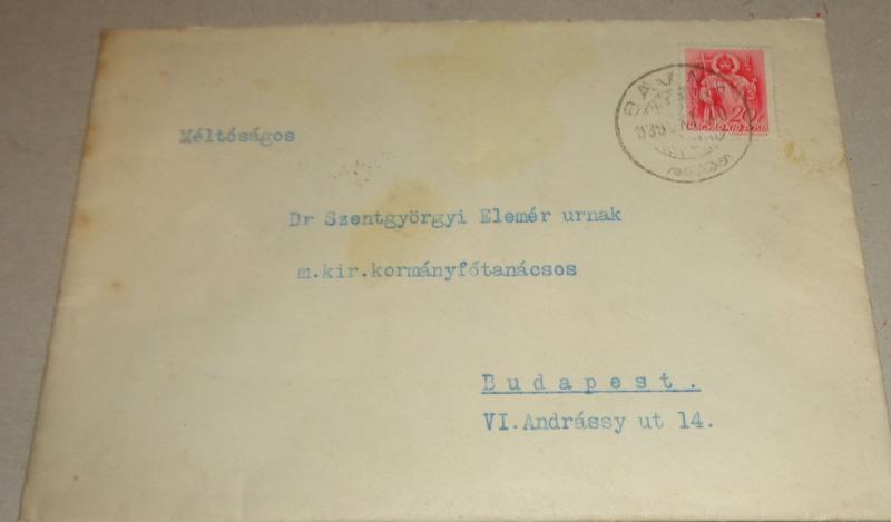 Ismeretlen levele, Dr. Szentgyörgyi Elemér kormányfőtanácsosnak.