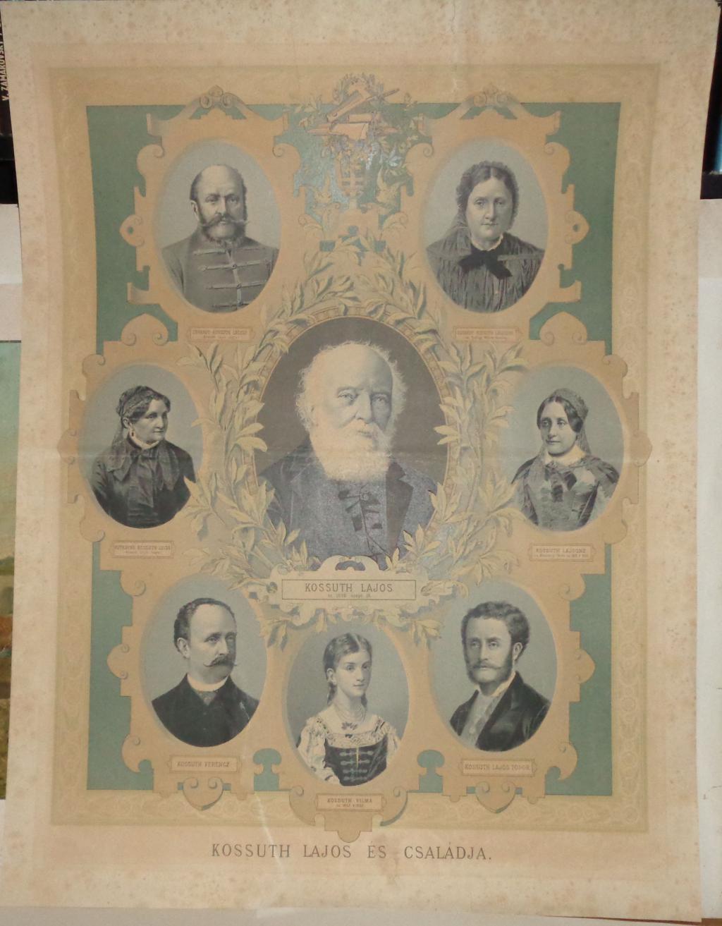 Középpontjában Kossuth nagyobb méretű, körülötte a család tagjainak kisebb méretű képével. Mellképek: