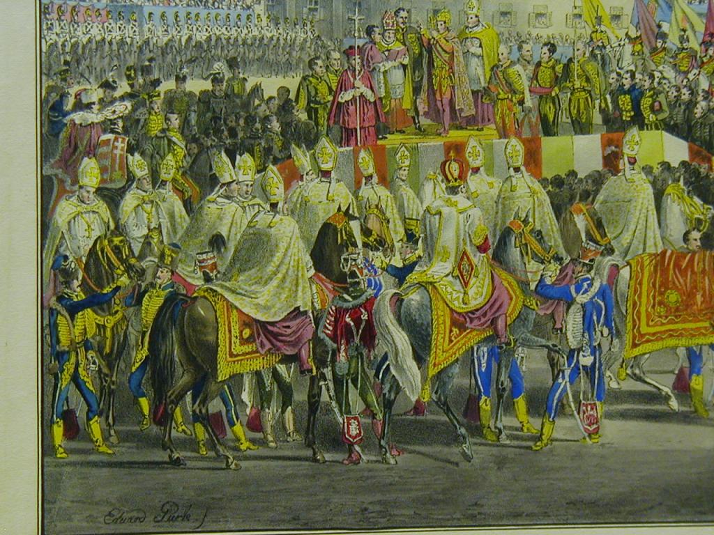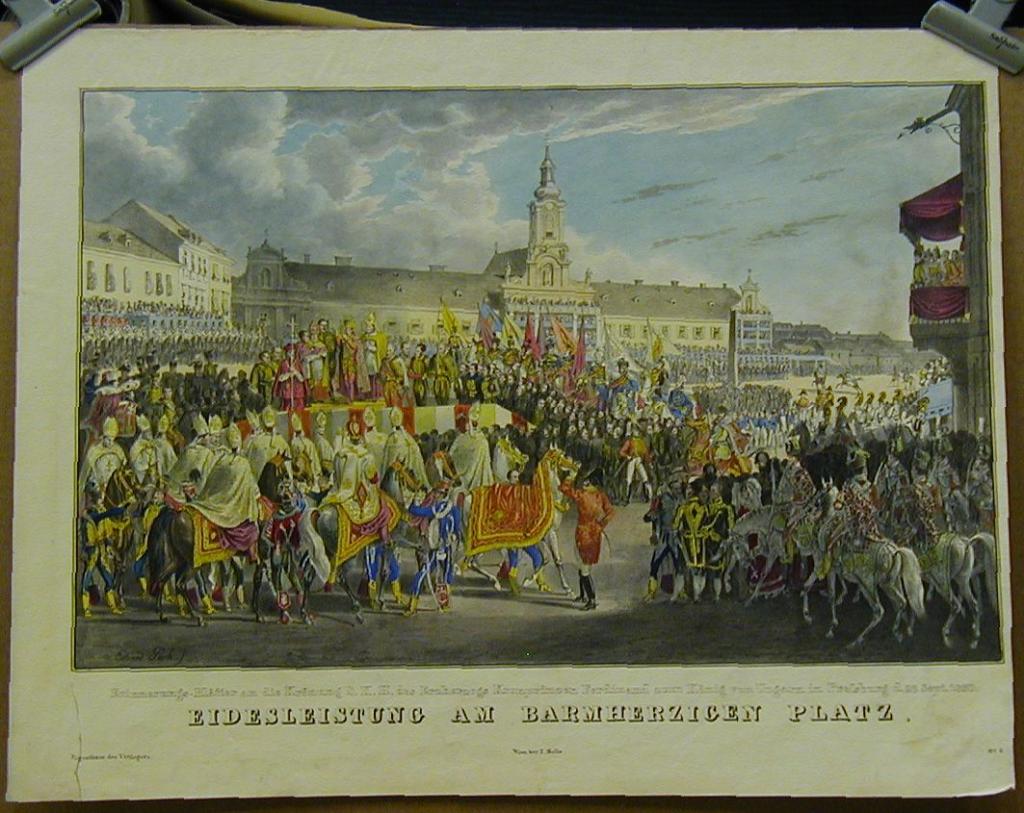 Koronázás, koronaGURK, EDUARD: Eidesleistung am Barmherzigen Platz. Erinnerungs-Blätter an die Krönung S. K. H. des Erzherzogs Kronprinzen Ferdinand zum König von Ungarn in Pressburg d. 28. Sept. 1830.